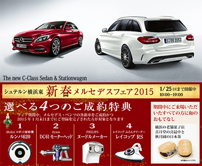 注目の新型車は当然のことながら、認定中古車まで豊富なラインナップを揃えるのが、正規販売店の「メルセデス・ベンツ日吉」。1月25日(日)まで開催している「新春メルセデスフェア2015」では、豪華な成約特典をはじめ、査定プレゼントや福引きなど多彩な企画が目白押しだ。ヒツジのメルセデス・ベアや親子で楽しめるラジコンセットが入った「メルセデス・ベンツ コレクション福袋」も用意。さらに、来場者全員に横浜の老舗菓子店「喜月堂」の喜最中でおもてなしも。「まずは見てみたい」という人も気軽に来場を。