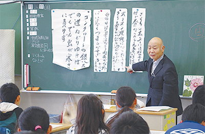 市内で活動する「沙羅短歌会」を主宰する伊藤宏見さんが講師となり、事前に児童たちが作ってきた短歌を一つずつ詠み上げ、講評した。短歌は冬や雪をテーマにした作品が多く、「児童たちの生活が表れていてとてもよかった」と伊藤さん。児童たちはもらったアドバイスをもとに自分の短歌を色紙に書き直した。