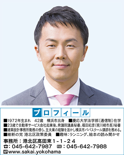 2025年、人口の4分の1が65歳以上になる超高齢者社会を迎えようとしています。そして生産労働人口と呼ばれる、働く世代は団塊世代のリタイアと共に著しく減っています。当然のことながら税収が減り、医療や介護を始めとする社会保障費が、年々増大してゆきます。私たち団塊ジュニアと言われる「働き盛りの30・40代」は背中には子どもたちの未来を背負い、両肩にはこれから老後を送る両親たちの医療や介護を抱えるのです。だからこそ、横浜と云う人口370万人が暮らす大きな家をしっかり支える「大黒柱」を作らなければなりません。