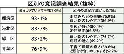 調査結果によると、住んでいる街に対して総合的に「暮らしやすい」と感じている人が市全体の平均77・5%に対し、一括りにされる横浜北部地域でも区別でばらつきがあることがわかった。
