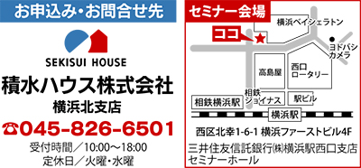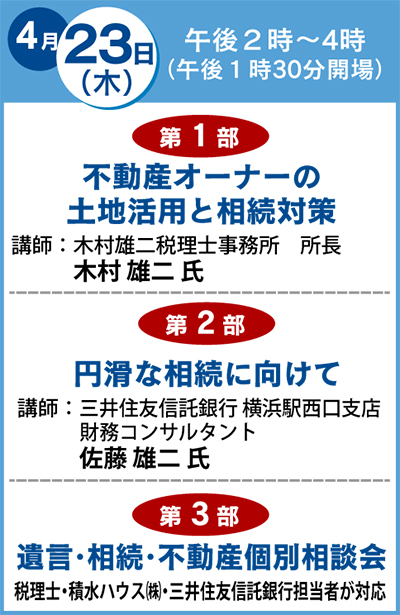参加費無料の『遺言・相続・不動産セミナー』(完全予約制・定員50人)が4月23日(木)、三井住友信託銀行横浜駅西口支店を会場に開催される。積水ハウス(株)主催で、三井住友信託銀行(株)共催。