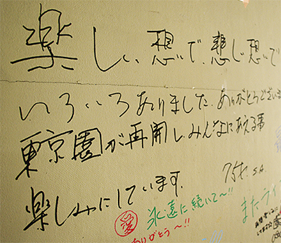 休園を公表した2日後の15日には、平日にも関わらず開園前に行列を作った。また、建物の内に設けられた落書きスペースには「東京園での思い出は宝物。再開を心待ちにしています」などのメッセージが書き込まれていた(=写真)。