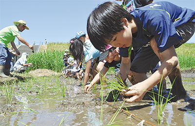 当日は天候にも恵まれ、青空の下、子どもたちの笑い声が響きわたった。田んぼに入った子どもたちは足をとられ、泥んこになりながらも、懸命に稲苗を植えていた。