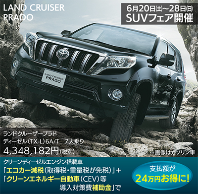 トヨタの正規販売店『トレッサ横浜店』では20日〜28日、新型ランドクルーザープラド発売を記念して人気のモデルが揃う「SUVフェア」を開催する。新型プラドはもちろん、70バンやFJクルーザー等6台の魅力を体感するチャンスだ。