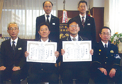 JR小机駅の高橋謙一駅長と佐藤哲也助役が振り込め詐欺を未然に防いだとして、港北警察署(陶山和美署長)は昨年末に感謝状を渡した。