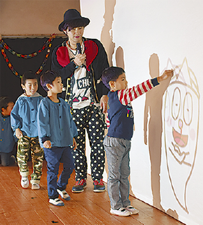 当日は、デジタルアートを駆使した「アニメ漫才」を得意とするお笑い芸人・アキラボーイが登場。スクリーンに映し出されたアニメを叩いたり、引っ張ったりすると反応を起こす不思議なパフォーマンスに園児は大興奮だった。