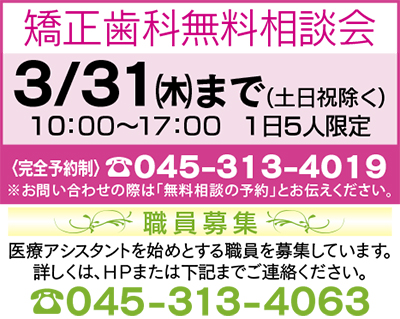 横浜駅西口徒歩3分にある神奈川歯科大学附属横浜クリニックでは現在、矯正歯科無料相談会を行っている。3月31日(木)まで。