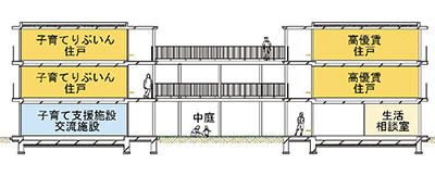 「多世代地域交流型住宅」は、既存の「高齢者向け地域優良賃貸住宅」(高優賃)と「子育て世帯向け地域優良賃貸住宅」(子育てりぶいん)を合築したもので、低所得者、市内在住者などが対象。収入に応じた家賃補助が受けられるメリットがある。