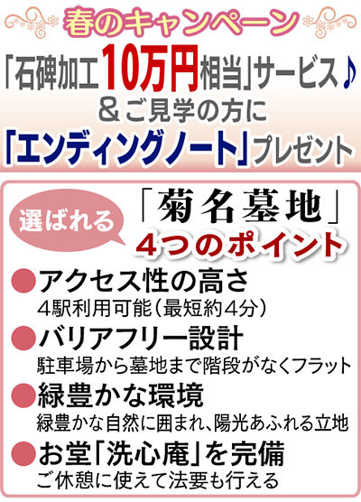 現在、石碑加工キャンペーンを開催中。「石碑加工10万円相当をサービス」してくれる。また、見学者にはもれなく「エンディングノート」がもらえるダブルプレゼントも。5月31日(火)まで。新区画は宗旨宗派不問(但し在来仏教)で1区画65万円〜(0・6平方メートル・永代使用料)。見学会は随時開催中。まずは問合せを。