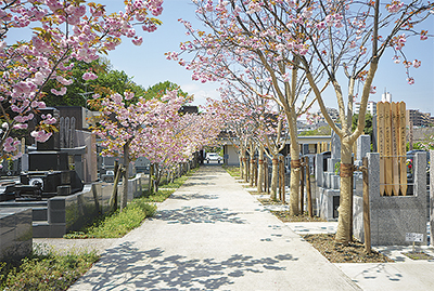 「菊名墓地」の魅力の一つが参道の八重桜。新区画造成中に一時的に退避させていた八重桜が戻され、この春も美しいピンク色で参道が彩られた。スタッフは「移植の影響が心配されましたが、満開に咲いてくれてお参りの方の心に安らぎを与えてくれています」と話す。