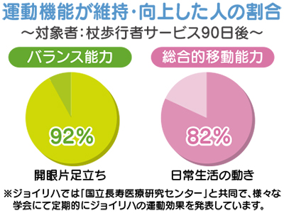 ジョイリハが利用者を対象におこなった体力測定では、90日間の通所で80%以上の運動機能が向上した例も。利用者からも「できることが増えた」「効果が実感できる」など好評の声も多く寄せられる。