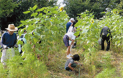 同会では、時期の過ぎた植物を腐葉土にし、次に咲かせる花の肥料とする「循環型花壇作り」を行っている。今回は現在ヒマワリが咲いている花畑にコスモスの種をまいた。自然物を肥料とすると、土の質が良くなり、開花期間が長くボリュームも出るという。子どもたちに自然に触れる喜びを伝えようと、企画された。