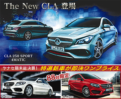 新型「CLA」、「CLAシューティングブレーク」の発表を記念し、デビューフェアも同時開催。スポーツパッケージは最新のメルセデスデザインを採用し、流麗なフォルムとスポーティーなデザインが印象的だ。新型Eクラスと合わせ、ぜひ試乗してほしい。