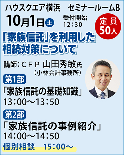 市内最大級の住宅展示場・ハウスクエア横浜で10月1日(土)、参加無料セミナー「家族信託を利用した相続対策について」が開催される。現在参加者を募集中だ。