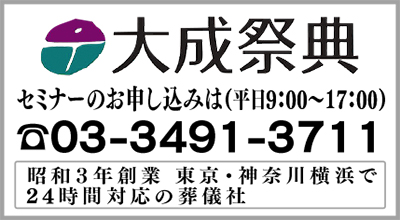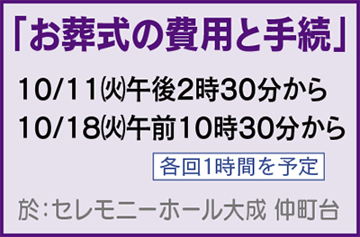 創業88年の実績をもつ大成祭典(株)は「セレモニーホール大成 仲町台」(都筑区仲町台5の6の14)で10月11日(火)・18日(火)、無料セミナー「お葬式の費用と手続」を開催する。