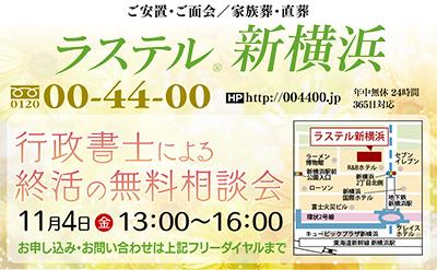 家族葬専門式場として高い評価を得る「ラステル新横浜」(新横浜駅8番出口すぐ)で11月4日(金)、『行政書士による終活無料相談会』が行われる。現在、参加者を募集している。時間は午後1時から4時までを予定。