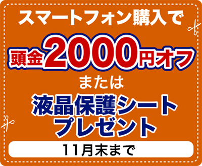 現在、スマートフォン購入時に左のクーポンを持って行くと、頭金2000円オフまたは液晶保護シートをプレゼント。11月末までの限定。