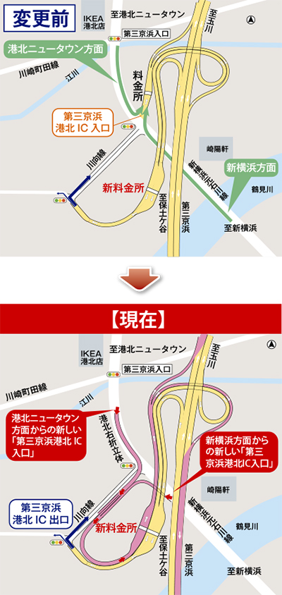 今月12日から変更となった「入口」は首都高速道路(株)神奈川建設局とNEXCO東日本、横浜市が整備を進めてきた。新たな入口は新横浜元石川線、IKEA港北店側の港北ニュータウン方面からは「港北右折立体橋」を通行する。一方、日産スタジアムのある新横浜方面からは左折専用レーンで料金所入口を目指す。港北ニュータウン方面、新横浜方面の両方向共に、信号で止まらずに入口に行けるので変更前よりスムーズに通行できる見通しだ。