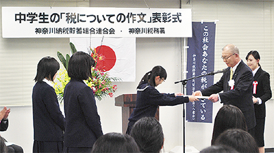 2016年度「中学生の税についての作文」の表彰式が先月末、神奈川税務署で行われた。神奈川納税貯蓄組合連合会(石川圀光会長)が、同税務署管内の港北・神奈川区の中学生を対象に募集。各区の中学校24校中19校から作品が集まった。