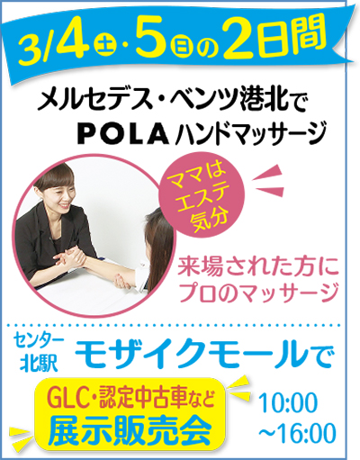 メルセデス・ベンツ港北では3月4日(土)・5日(日)、来場者にPOLAのハンドマッサージを提供。センター北駅のモザイクモールでも人気のGLCや認定中古車など展示販売会を開催する。お買い物がてら、気軽に立ち寄ってみては。