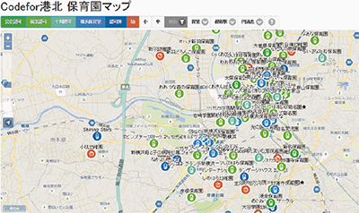 港北区地域子育て支援拠点どろっぷは、区内の保育園や幼稚園などを地図上で閲覧できるサイト「Codefor港北保育園マップ」を開設した。手がけたのは同施設のスタッフや子育て中の区民。プログラミングの知識がない状態から作り上げた。
