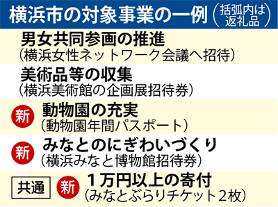 これに歯止めをかけようと市は17年度から同制度の見直しに着手。1万円以上の寄付に対して横浜駅からベイエリアの市営バス・地下鉄一日乗車券「みなとぶらりチケット」2枚を用意するほか、「動物園の充実」など対象事業を9種増やして「動物園年間パスポート」などを提供する。