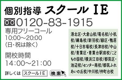 現在スクールIEでは、春期講習を開講しており、今なら無料体験授業の申込みも受付け中。担当者は「個別指導ならではのカリキュラムで、学習課題をサポート致します」と呼びかける。詳しくは左記【フリーダイヤル】か検索を。