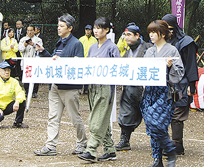 9日の城址まつりでは、祝いの横断幕を持ち、行進する市民の姿もみられた。