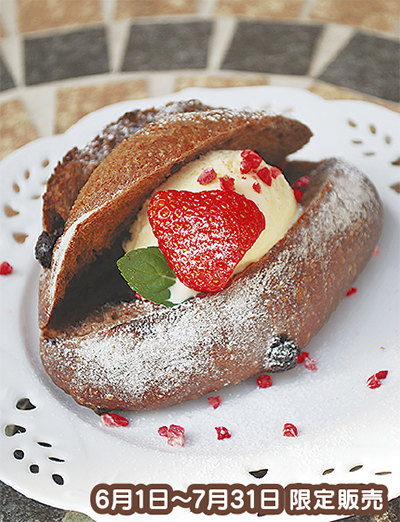 エントリー商品の「パンカカオとアイスの幸せサンド」(税込320円)は店で常時販売している人気商品の「パンカカオ」に、リッチなバニラアイスと季節のフルーツを挟んだ一品。低温長時間発酵のパン生地はもっちりしっとり。カカオ度数の高いチョコを生地に練りこんでいるため、パン自体のチョコの甘さは控えめでアイスの甘さとフルーツの酸味のハーモニーが幸せを運ぶ。