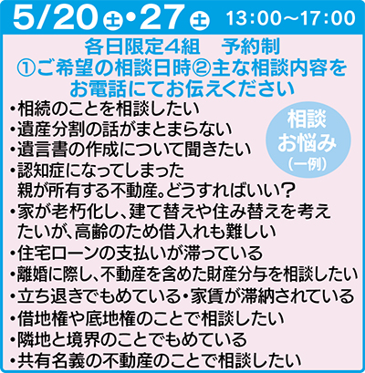 不動産に関する様々な相談を1組1時間、じっくりとできる貴重な機会。各日限定4組。予約制につき、申込みは電話で。