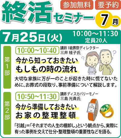 2部制のセミナーは午前10時から11時半。参加費無料で要予約【フリーダイヤル】0120・02・8888。1部は万が一を想定した「今から知っておきたいもしもの時の流れ」をテーマに、慌てないための事前準備や段取りを解説してくれる。講師は事前相談を担当する1級葬祭ディレクターの三井桂子さん。
