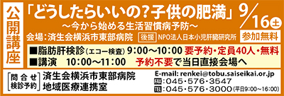 小児科医師らに子供の肥満や生活習慣病予防について学ぶ、無料の市民公開講座が9月16日(土)、済生会横浜市東部病院の3階多目的ホールで行われる。