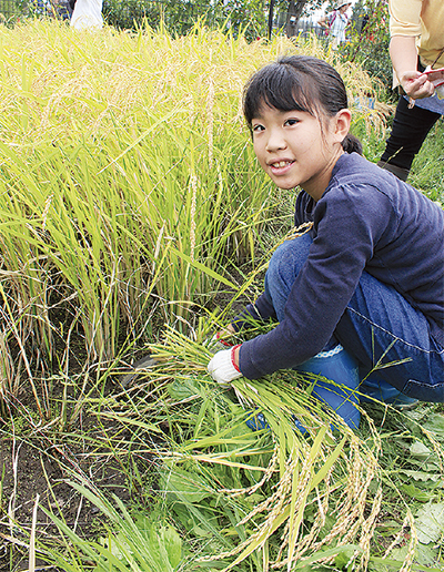 大倉山、新羽、新横浜地区などから約50人の子どもたちが集まり、稲刈り。しゃがみ込むと自分たちよりも背の高い稲穂の中で、懸命に刈っていた。収穫量は約70キロ。11月末に脱穀し、来年2月のもちつき大会などで使用するという。
