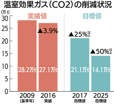 現在、市は18年度から始まる第3期推進計画を策定中。同局は目標とのかい離を認めた上で、「達成に向け、市民や事業者の皆さんと協力して取り組んでいきたい」と話している。