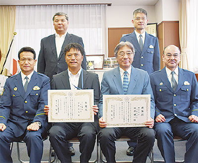 港北警察署(牧智明署長)は5日、振り込め詐欺被害を未然に防止したとして、JA横浜日吉支店・今野将志さんと横浜銀行大倉山支店・服部健一さんに感謝状を贈呈した=写真。