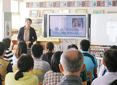 二宮さんは城ラマ作成に至るまでの経緯、小机城の背景などについて面白おかしく説明。参加者からは度々笑い声が上がっていた。