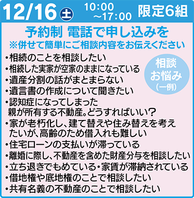 不動産に関する様々な相談を1組50分間、じっくりとできる貴重な機会。限定6組で予約制(先着順受付)。申込みは電話で。