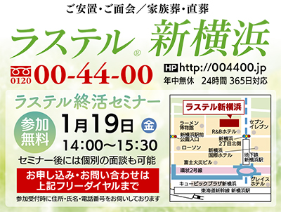 新横浜駅北口8番出口すぐにある、家族葬専門式場「ラステル新横浜」で1月19日(金)、『ラステル終活セミナー』が開かれる。参加無料。時間は、午後2時〜3時半。