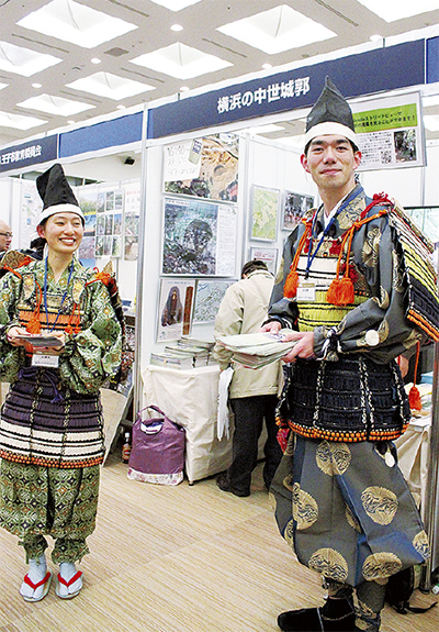 横浜の中世城郭ブースでは各城郭に関する資料や写真を展示。区職員も手製の鎧姿で駆けつけ、行き交う来場者にPRを行っていた。