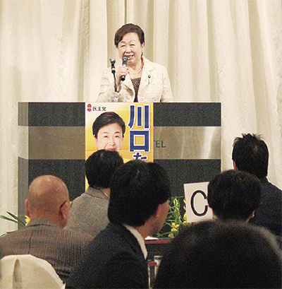 港北区選出の横浜市会議員・川口珠江氏(民進党)の新春のつどいが2月4日、新横浜グレイスホテルで開催された。支持者や関係者らが約180人集まり、賑わいを見せた。
