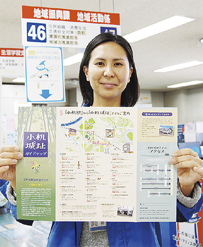 港北区役所4階、地域振興課に置かれている小机城址ガイドマップは、港北観光協会により1万部が制作、発行された。今このマップへの注目が高まり、同課に立ち寄った際に持ち帰る来庁者も多いという。