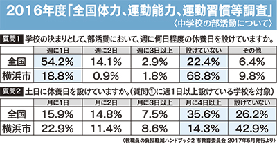 また、16年度にスポーツ庁が全国の中学校を対象に実施した「全国体力、運動能力、運動習慣等調査(=表参照)」では、「学校の決まりとして部活動で、週何日程度の休養日を設けているか」という設問に、週1日設けている学校が全国では5割以上、対して横浜市では設定がない学校が約7割と多い。今年度中に策定される同庁の「運動部活動の在り方に関する総合的なガイドライン」の骨子では、休養日は平日1日以上、土日1日以上の指針が示される予定。市教委では、今後も同ガイドラインに沿い、より良い部活動の在り方を検討するとしている。