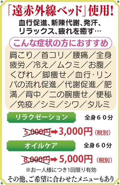 37年の実績を誇り、先月元住吉にもオープン!独自の手技で血液・リンパの流れを促し、身体に溜まった老廃物・毒素を徹底的に取り除き新陳代謝をアップ。体調・サイズの変化を実感できるのが魅力だ。