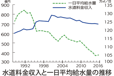 水道事業収入の約7割は家庭や事業所の水道料金が占めるが、水需要は1992年をピークに減少傾向が続く。96年の渇水を機に節水への関心が高まったことも後押しし、この20年間で一日平均給水量は20万トン減少し、料金収入に大きな影響を及ぼしている。