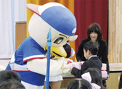 授与式ではサッカーJ1、横浜F・マリノスのクラブキャラクター「マリノスケ」が登場し、1年生の代表4人にランドセルカバーを手渡した=写真。