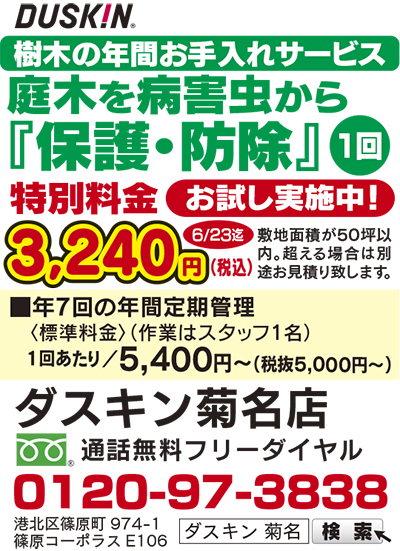 ダスキン菊名店では、通常1回5400円〜のところ、1回のみお試し3240円(税込)で実施中。今の季節は害虫、ダニ、病気による初期の病害虫発生のシーズン。この機会にプロのお手入れをぜひ体験を。