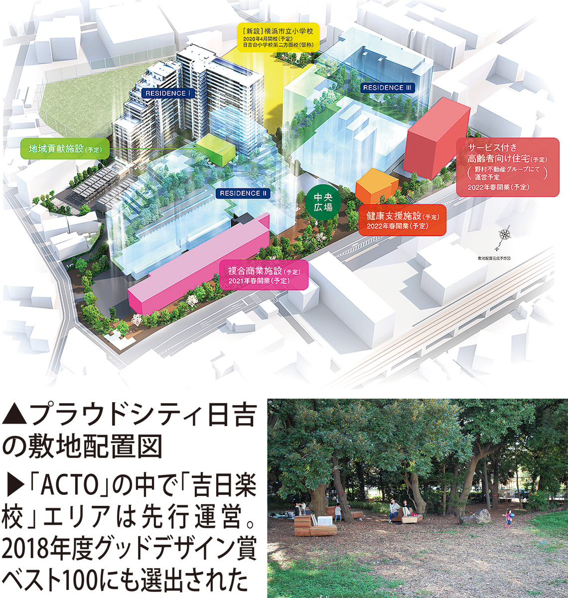 「プラウドシティ日吉」は、東急東横線日吉駅徒歩9分の地で現在同グループが推進している開発敷地総面積5・4haの大規模複合開発プロジェクト。全1320戸の分譲マンションのほか、複合商業施設や新設の市立小学校、健康支援施設、サービス付高齢者向け住宅などの建設が予定されている。同プロジェクトに初めて導入されるのが「BE UNITED構想」。登壇した野村不動産(株)宮嶋誠一代表取締役社長は「ふなばし森のシティ」でマンション引き渡し後もコミュニティ形成に対して同社が積極的に関わった事例を踏まえて、2016年より構想を練り上げたとする。その中でわが街をよりよく育んていこうと考える「シビックプライド」の醸成をめざし、その実現のために必要な活動を、”あくとびら”を意味する「ACTO(アクト)」と定義づけたという。