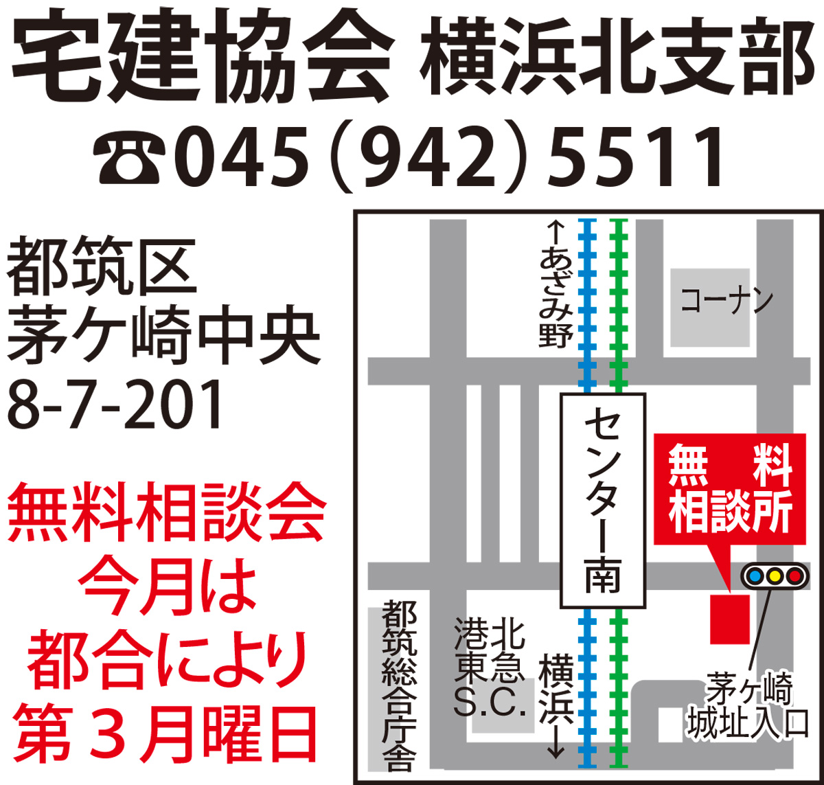 相続や資産運用のことなど、住まいに関する疑問に無料で答えてくれる相談会が11月19日(月)、都筑区で行われる。主催は(公社)神奈川県宅地建物取引業協会横浜北支部。会場はセンター南駅徒歩2分の同支部無料相談所で午後1〜4時。申込不要。