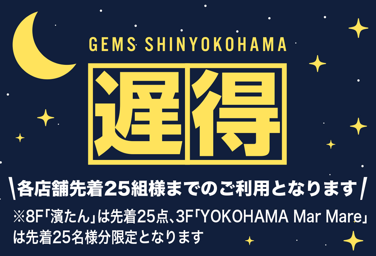 JR新横浜駅徒歩5分、今年8月にオープンしたグルメタワー「GEMS新横浜」(新横浜2の5の17)。素材にこだわった県内の繁盛店を誘致、商業施設初出店を含む10店舗が入店。現在、各店先着25人限定で、20時以降の「遅得」実施中。