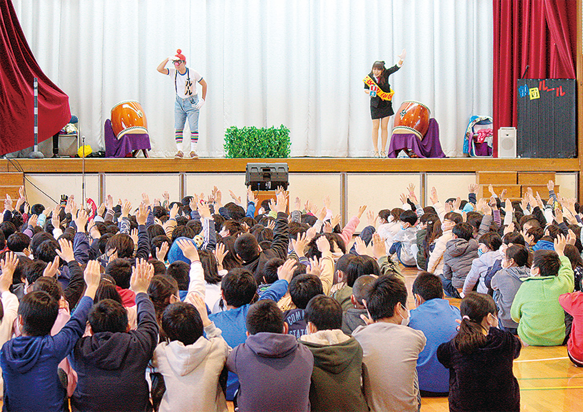当日は日吉自動車学校の指導員で構成された「劇団ルール」が登場。小学校や商業施設などで交通ルールを啓発する劇を公演しており、港北区では同校が初。歌やダンスを織り交ぜたコメディタッチな内容で、児童らは笑いの嵐。流行りの曲に乗せて劇団員が踊り出すと、大きな手拍子で盛り上がりを見せていた。